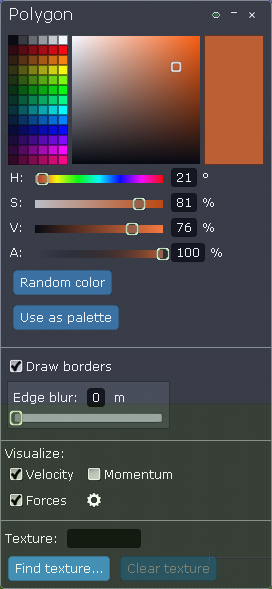 Můžeme měnit barvu, vykreslovat okraje (Draw borders) okolo objektů, zobrazit rychlost, hybnost, síly.