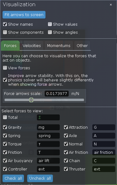 Ikona ozubeného kolečka nás odkazuje na pokročilé možnosti zobrazení sil, rychlostí, hybností a další. Obsahuje pokročilé možnosti vizualizace. Systematicky je zde probírat nebudeme, narazíme na to později u tvorby jednoduché nebo komplexní scény. Pouze si ukážeme obrázek této nabídky, čtenář, ať si udělá obrázek o komplexnosti tohoto programu sám.