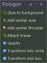 Add center thruster (Přidej centrální proudový motor) - do těžiště přidá raketový motor. Viz Základní operace.
