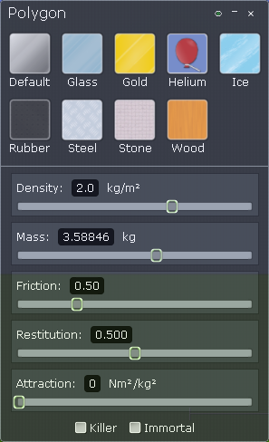 přitažlivost (attraction) - Těleso začne přitahovat ostatní tělesa, jednotkově odpovídá gravitační konstantě. Díky tomu lze nasimulovat obíhání dvou těles kolem společného těžiště(!)