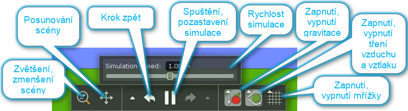 Jak vidíte na obrázku výše, prvky prostředí lze zapínat a vypínat na liště kontroly simulace. Zapínáme a vypínáme gravitaci, tření vzduchu a vztlak, mřížku.