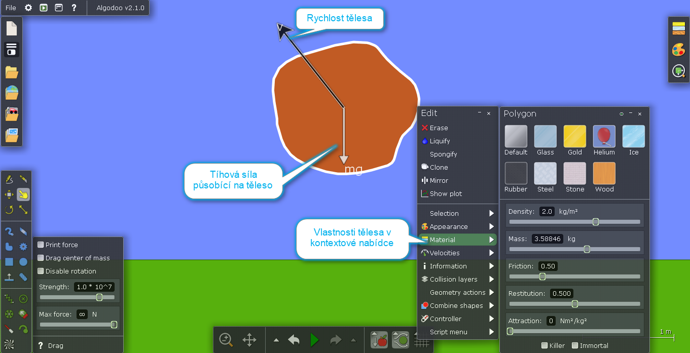 Všimněme si, že u tělesa je zapnuto zobrazení vektoru rychlosti a tíhové síly, simulace je pozastavena. Pro zajímavost je vyvoláno kontextové menu, ve kterém vidíme, že těleso má hustotu 2 kg.m -2. hustota má tuto jednotku proto, že pracujeme v dvourozměrném(!) prostředí. Dále je uvedena hmotnost a další parametry o kterých budeme mluvit později. Všimněme si, že všechny parametry se mohou měnit průběžně i během simulace pomocí posuvníku nebo přepsáním hodnoty. Tím je zajištěna vysoká míra interaktivity a možnost simulace takovým způsobem, který by fyzicky možný nebyl (např. prudká změna hmotnosti nebo hustoty.)