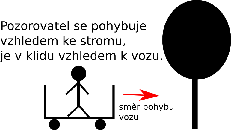 První vůz se pohybuje vzhledem k druhému vozu, druhý vůz je v klidu vzhledem k lavici.