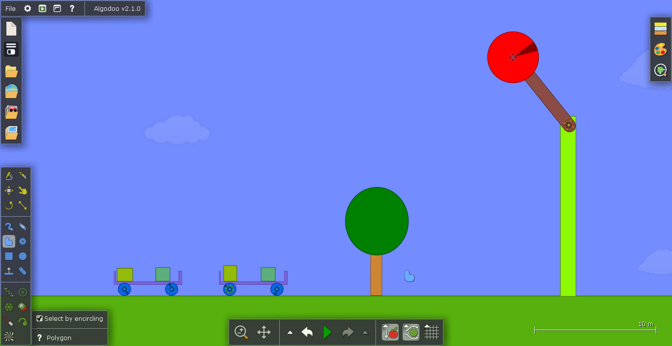 Na vizualizaci žáci vidí dvě auta - pravé se pohybuje směrem doprava. Vpravo je strom a kolotoč. Podle míry pochopení pohybu a klidu žáky ve třídě přepínáme pomocí parametru Follow (v Selection) na jednotlivé objekty a ptáme se, vzhledem k čemu jsou v klidu a vzhledem k čemu v pohybu. Můžeme také propojit auta pomocí lana (Chain tool -> Rope) Opakujeme prakticky stejné otázky jako v předchozí části. (Díky příkazu Follow, který objekt zafixuje, takže je v klidu vzhledem k žákům (tedy pozorovateli) názorně ukážeme relativitu klidu a pohybu.)