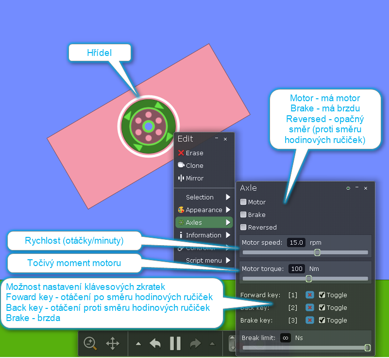 Pomocí nástrojové lišty a příkazů "Thruster tool" nebo "Axle tool" (více viz Seznámení s prostředím Algodoo)