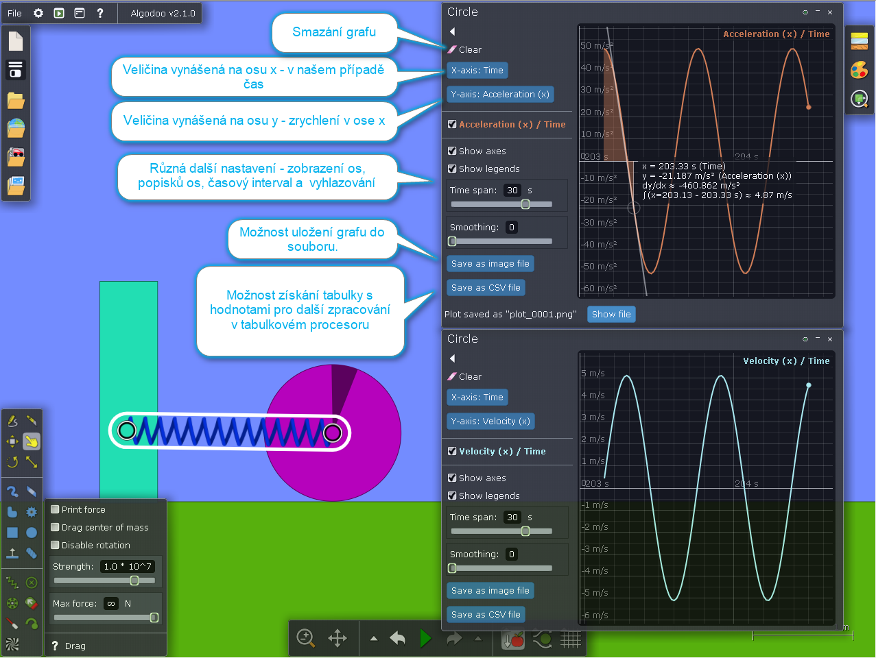 Algodoo může vykreslit hodnoty veličin v přehledných grafech. Tyto grafy se vykreslují v reálném čase simulace, takže žák před sebou vidí simulaci a současně hodnoty vynesené do grafu.