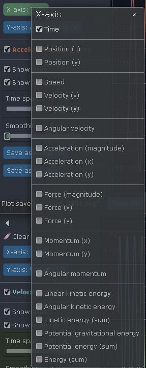 Na osu x nemusíme vynášet jen čas, ale různé veličiny. To samozřejmě platí i pro osu y. Viz následující obrázek. Na tomto obrázku lze vidět, které veličiny můžeme zobrazovat současně na jedné ose.