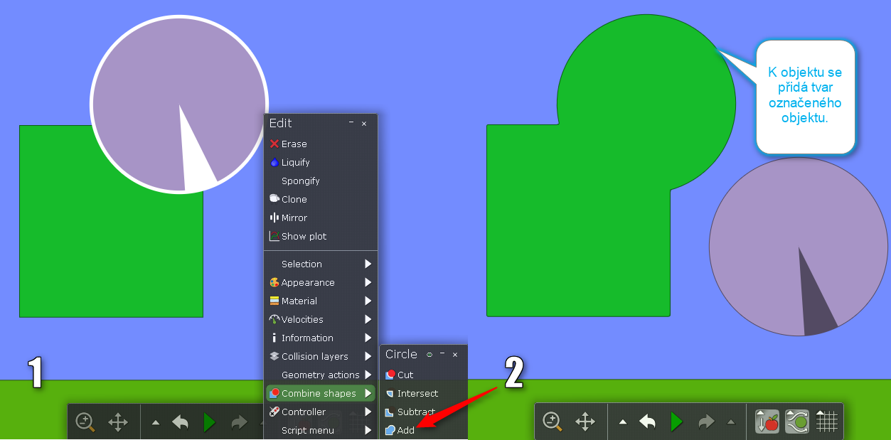 Add (Přidej) - sloučí dvě tělesa do jednoho.