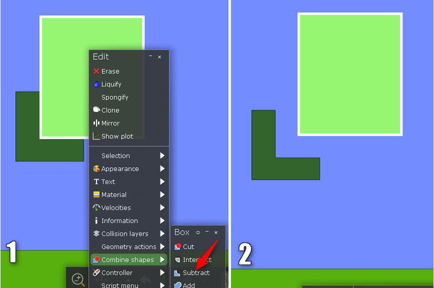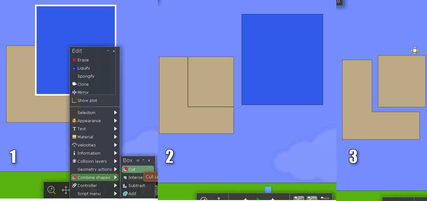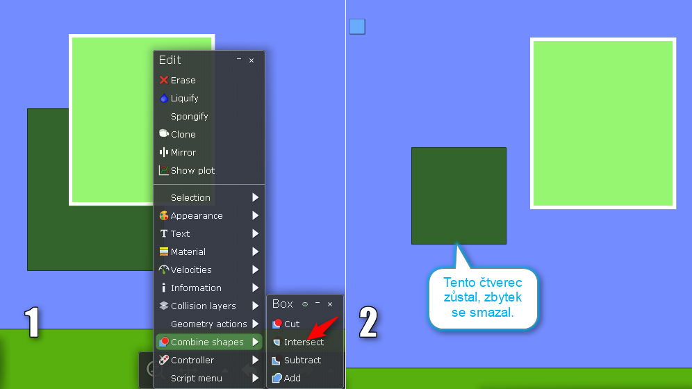 Cut (Odřízni) - rozřízne těleso podle tvaru jiného tělesa.