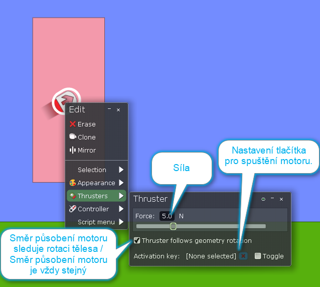 Thruster (Raketový pohon) - dodává konstantní zrychlení (nastavujeme sílu).
