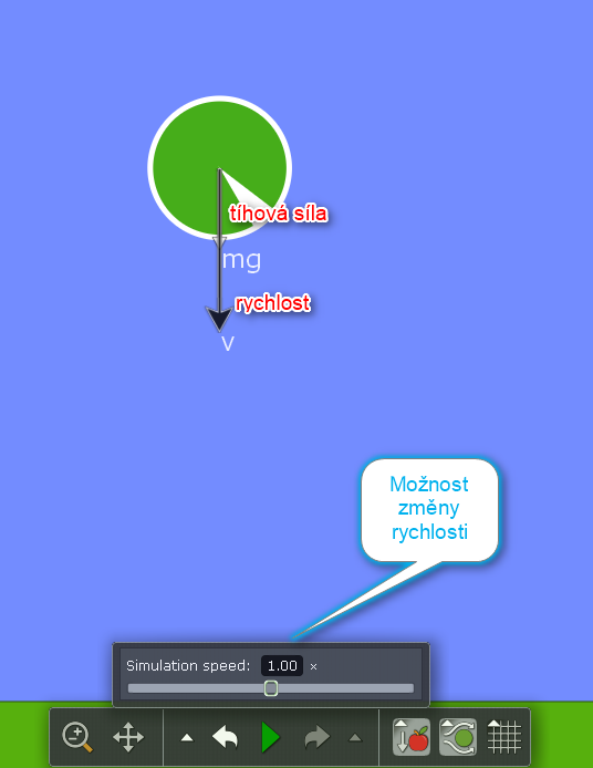 Vizualizace mechanických jevů by nebyla názorná bez zobrazení vektorových veličin. Při porovnání se zobrazením na tabuli, je velká výhoda v možnosti krokování simulace a zobrazení změny velikosti nebo směru této veličiny. Tak můžeme kupříkladu vidět při volném pádu dva vektory: vektor síly (force) a vektor rychlosti (velocity). Vše se nachází v kontextové nabídce Velocities -> Vizualize. Také je vhodná kombinace se sledováním objektu, kdy objekt zůstane uprostřed obrazovky a pohybuje se vše okolo (Jde tedy o změnu vztažné soustavy). Tato možnost se nachází v kontextové nabídce Selection -> Follow.